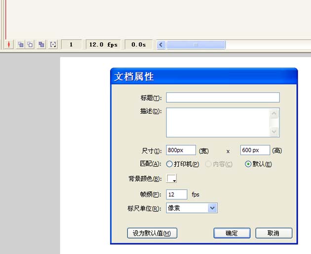 1、首先啟動flash8,執行文件-新建命令,新建一個大小為800*600,幀頻為12fps,背景顏色為白色的文檔。