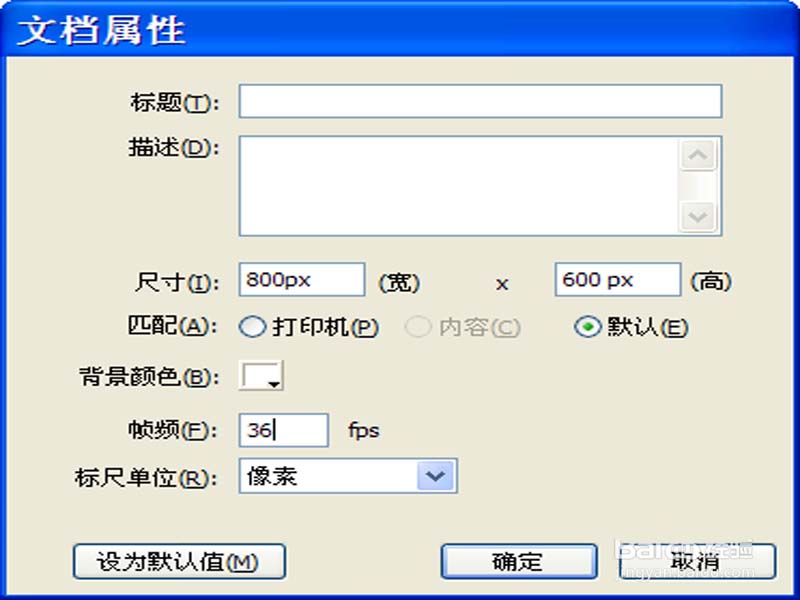 1、首先啟動flash8,執行文件-新建命令,新建一個幀頻為36fps,背景顏色為白色,大小為800*600的文檔。