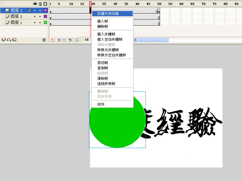 7、選擇圖層3的第50幀將圓形拖拽到右邊,右鍵單擊圖層3從下拉菜單中選擇遮罩層選項,這樣就把圖層3設置為遮罩層,圖層2為被遮罩層。