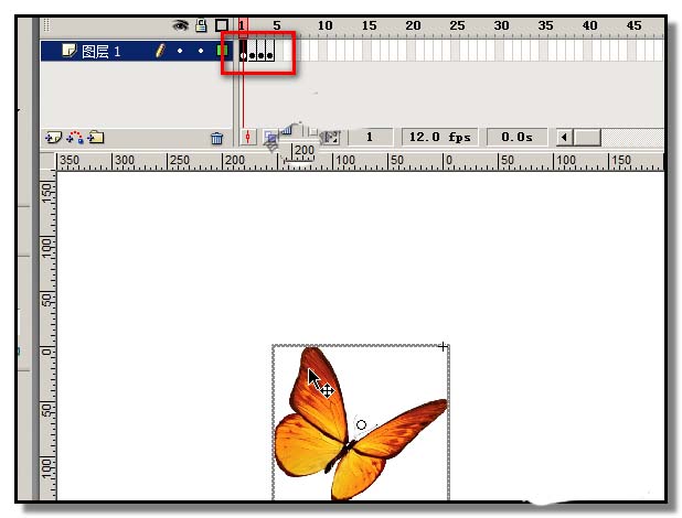 5、在背景圖層60幀位置插入鍵。新建圖層命名為蝴蝶1;把蝴蝶圖片導入到庫,新建影片剪輯元件,把蝴蝶1圖片拖入到元件操作界面中;調節好位置,然后,選取任意變形工具,把蝴蝶選中;然后,在第2幀位置插入關鍵幀,并把蝴蝶雙翼往內收點,再在第3幀處插入關鍵幀,同樣是把蝴蝶雙翼往內再收一點;到第4幀,插入關鍵幀,把蝴蝶雙翼完成收起合在一起。