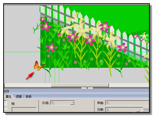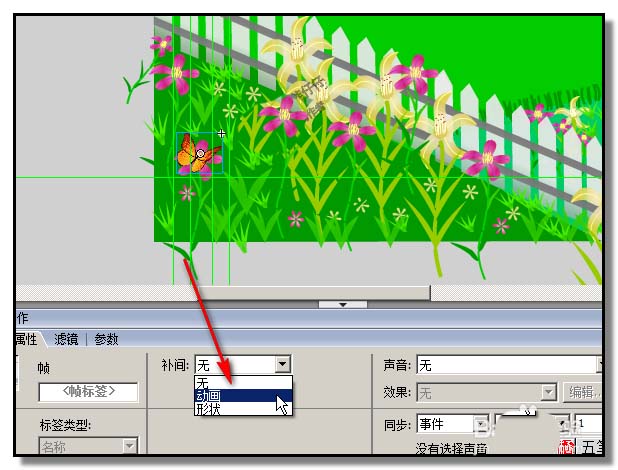 6、然后,把蝴蝶1元件拖放到場景舞臺左下角,然后,在蝴蝶1圖片第15幀位置,插入關鍵幀,接著,把蝴蝶移到花朵上。再在第1至第15幀任意幀上點下,在屬性面板這里,設置動畫補間。完成蝴蝶進入花園飛到一朵花上的動作;蝴蝶會在一朵花上停留一些時間,所以再這樣操作:復制第15幀,然后,粘貼到第16至第20幀。
