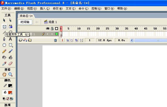 1、打開Flash軟件(這里用的Flash8.0版的軟件)。可看到軟件的界面,繪制動畫在舞臺畫布上制作,這里鼠標(biāo)選擇工具欄上的任意變形工具,如下圖所示。