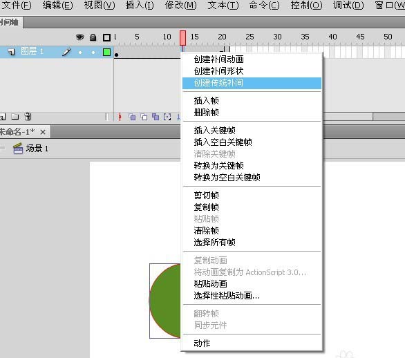 6、在時間軸開始與結束中間的位置,右鍵單擊,選擇創建傳統補間。
