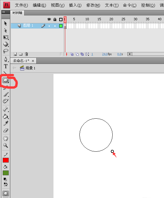3、選中左側圖形工具,在舞臺(中間的白色區域)上隨便畫一個合適的圖形。