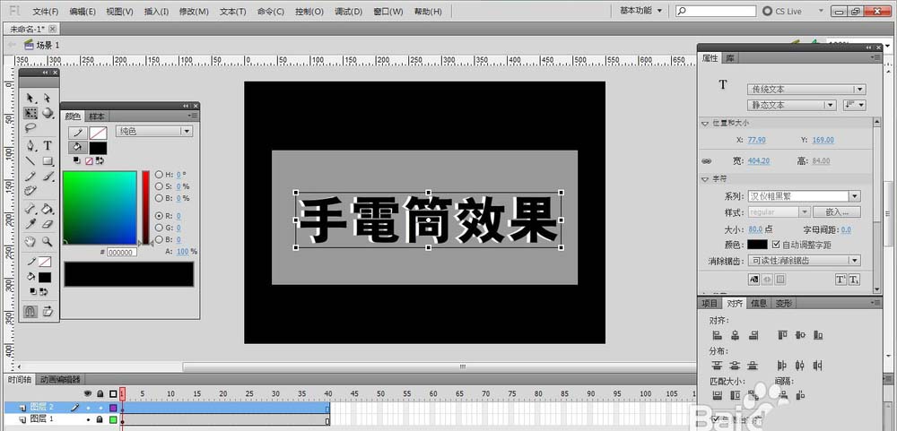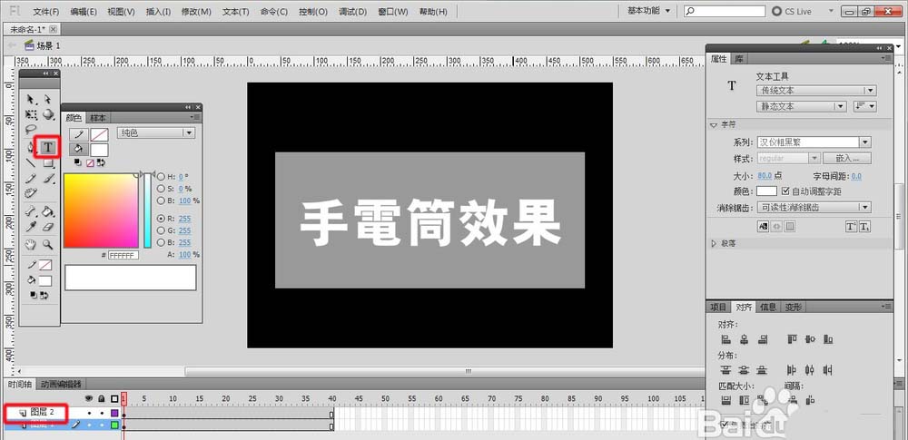 3、新建圖層2,選擇“文本”工具,在灰色區(qū)域輸入白色文字,并在第40幀按下“F5”鍵插入幀。