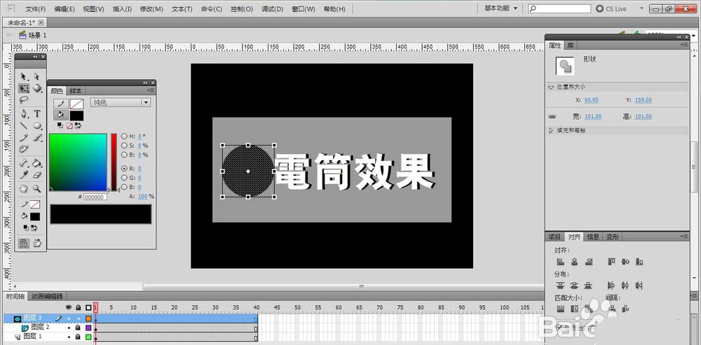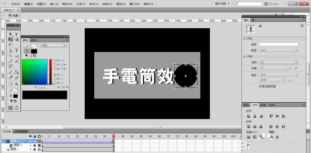 7、在圖層3的第1幀處繪制正圓遮住第一個(gè)文字。