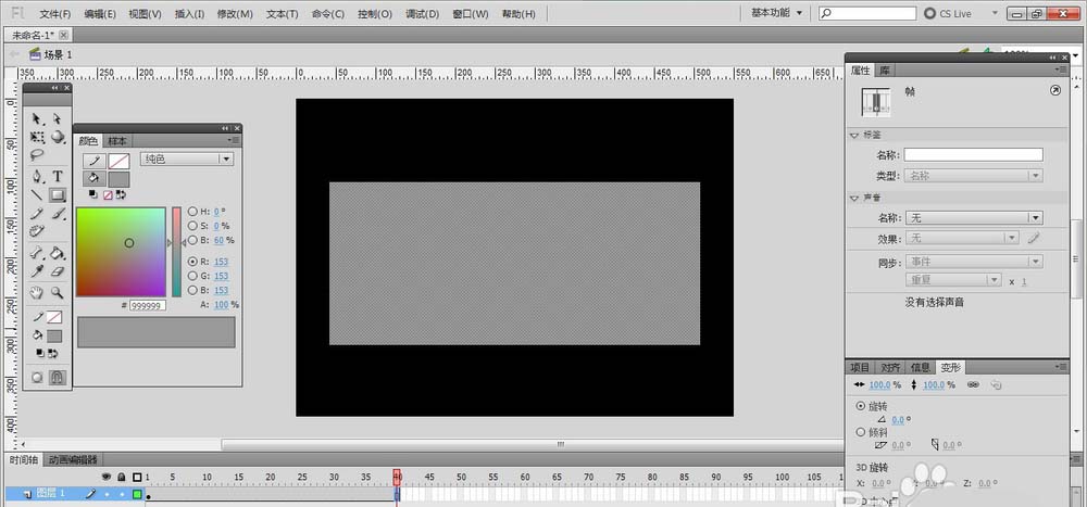 2、在舞臺上繪制一個(gè)淺灰色的矩形,在第40幀按下“F5”鍵插入幀。