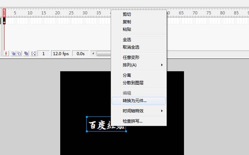 2、選擇文字工具輸入文字內容,設置 字體為王羲之書法字體,字號50,右鍵單擊從下拉菜單中選擇轉換為元件選項,將其轉換為圖形元件。