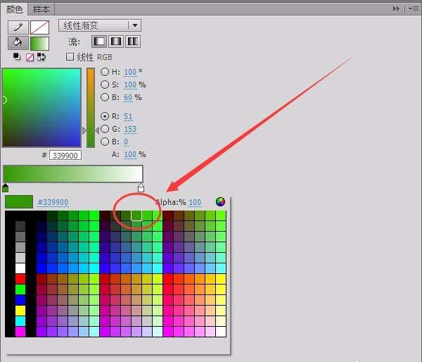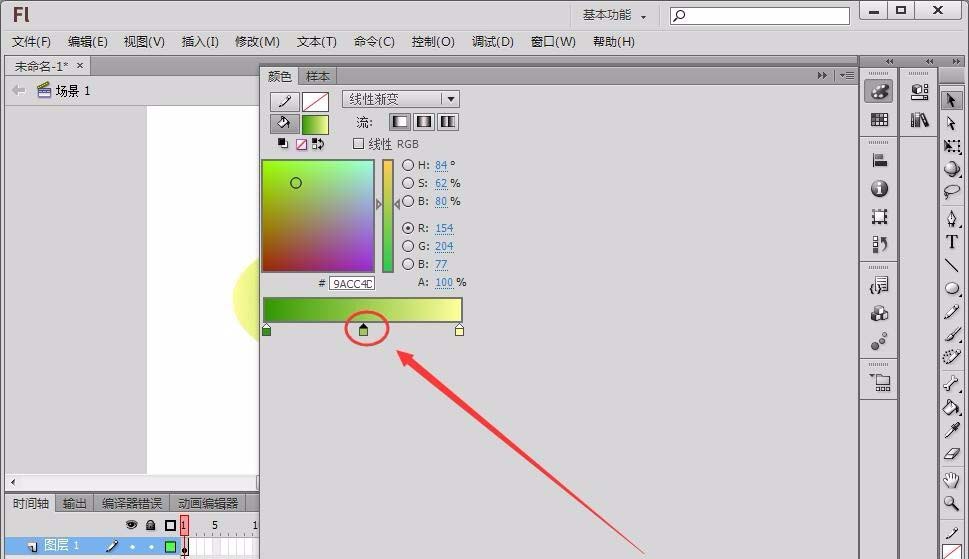 9、選擇“顏色”面板中的“徑向漸變”選項,可以在舞臺繪制徑向漸變色的橢圓。