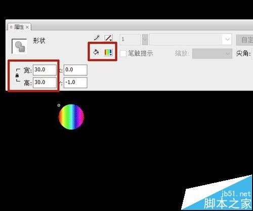 3、第5幀添加關(guān)鍵幀。更改圓的寬高,填充色改為彩虹漸變。