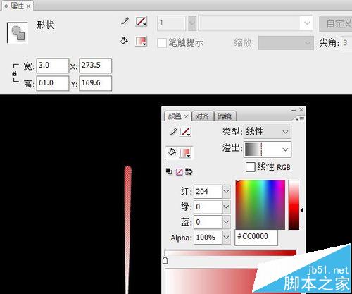 10、回到場景,線條工具繪制一個長長的水滴形狀,填充上由紅到白的漸變色。刪除線條。具體數(shù)值看圖。