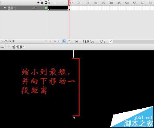 11、第15幀插入關(guān)鍵幀,回到第1幀,將形狀縮小到最小,并向下移動一段距離。創(chuàng)建形狀補間。