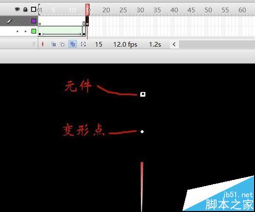 12、新建一層,在第16幀插入關(guān)鍵幀。從庫中將碎花元件拖入,Q鍵調(diào)出變形工具,將變形點向下移動。