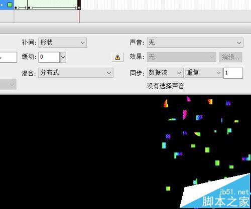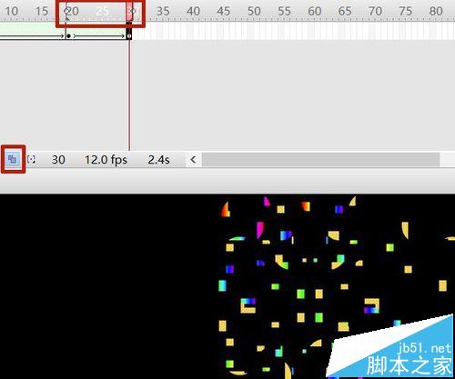 8、將碎片拉的更散些?;氐降?0幀創(chuàng)建形狀補間。為了看到前后對比,圖中是打開了編輯多個幀,使20幀的彩色碎片與30幀的黃色碎片同時顯現(xiàn)。