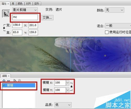 9、F8鍵將其轉換為影片剪輯元件,屬性面板中實例名設為:mc。濾鏡面板中添加模糊濾鏡。設置如圖。參數視各人影片大小而定。