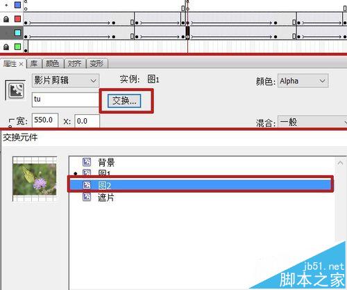 14、圖片層,在屬性面板中,將復制的幀中每一個關鍵幀的元件全部換成圖2元件。方法:選中原元件,屬性面板中點交換,在新出現的面板中選擇圖2元件。