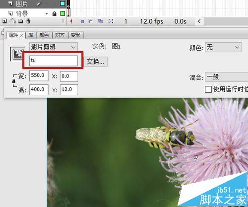 5、選中圖片層元件,屬性面板中設置實例名為:tu。