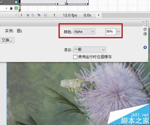 7、回到幀1,屬性面板中選顏色——Alpha——50%,再到35幀,Alpha值改為0%。如圖設置補間動畫。做出由半透明到完全顯示,短暫停頓后,再完全消失的過程。