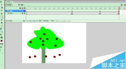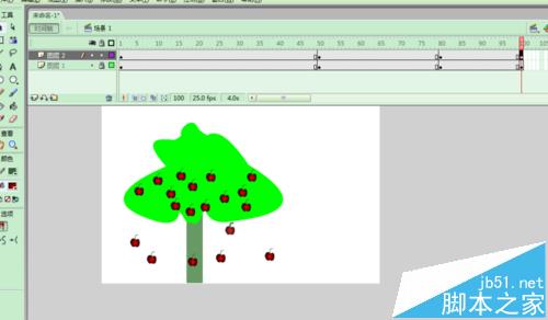 用FLASH模擬熟透的蘋果,用到形狀補間,注意形狀補間的使用條件。