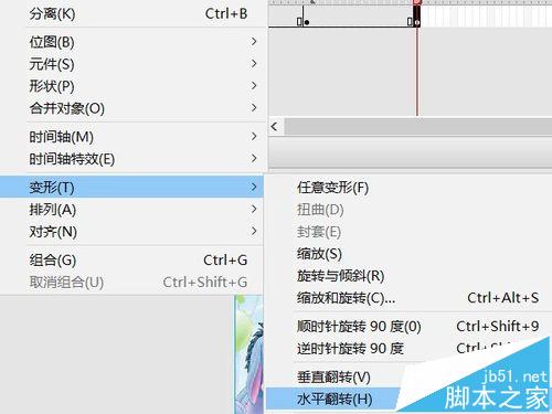 9、選擇60幀元件,菜單修改——變形——水平翻轉(zhuǎn),將元件翻轉(zhuǎn)。