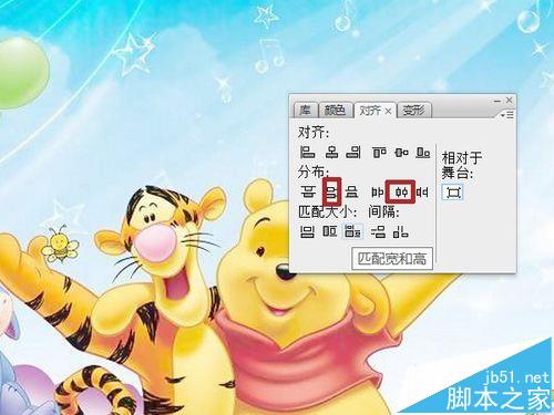 3、對齊面板中,點擊“匹配寬和高”、“水平居中分布”、“垂直居中分布”,使圖片與舞臺同大小、同位置。