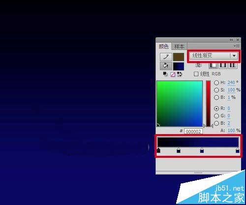1、油漆桶工具設(shè)置為線性漸變,填充條色標如圖,將背景填充為夜色。