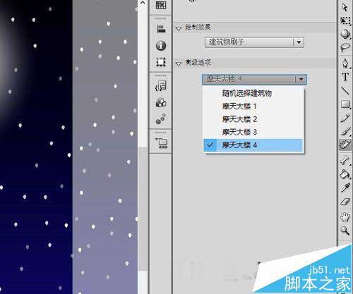 ①工具欄中調(diào)出Deco工具,屬性面板繪制效果中選擇“建筑物刷子”,高級選項里選擇“摩天大樓4”。