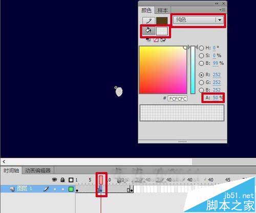 2、Ctrl+F8新建一個影片剪輯元件,取名星。繪制一個橢圓,填充白色。時間軸上設(shè)置三個關(guān)鍵幀,然后將中間一幀的透明度改為50%。