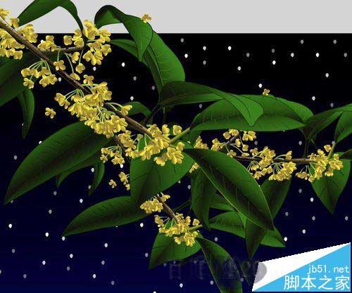 6、新建一層,取名桂花。將繪制好的桂花拖入(繪制方法見下面的經(jīng)驗引用),調(diào)整好大小、方向,放入左上角。