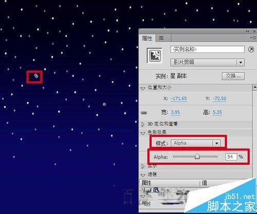 3、舞臺上新建一層,取名星。庫中拖入星元件,按住Alt鍵復(fù)制,一個復(fù)制兩個,兩個選中,復(fù)制為四個……如此復(fù)制整個夜空;全部選中后,再次復(fù)制一面,屬性面板中將Alpha值降低,如圖。成為有明有暗的星空。