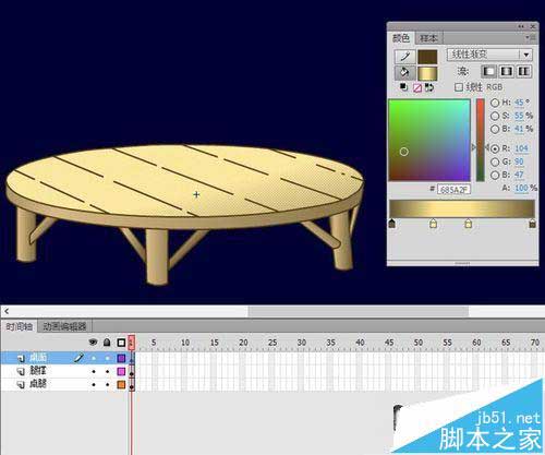 7、新建一個圖形元件,取名桌子。分別用橢圓、線條、圓角矩形繪出桌面、桌腿與腿撐。漸變填充如圖。