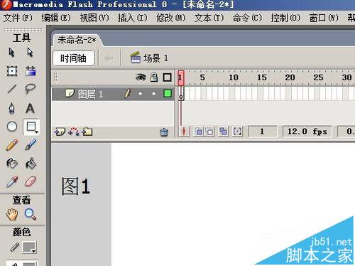 1、以圖中新建flash8文件為例演示操作步驟 ;在界面的左側工具箱中點“矩形”工具圖標;再點“填充色”圖標;