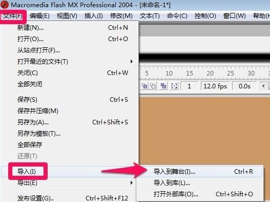 3、當然這里我們可以自己在窗口中繪制圖形,比如繪制一個齒輪,但是這里為了給大家介紹旋轉動畫的制作方法,這里小編就不繪制了,這里我們直接用網上下載好齒輪的圖片使用。點擊文件菜單,導入,導入到舞臺,當然你也可以導入到庫中,這里小編就直接導入到舞臺上吧。