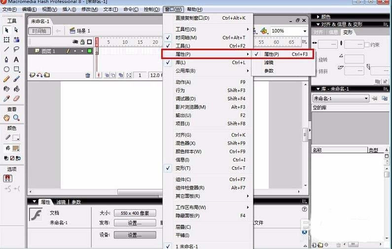 6、“屬性”面板的添加,需要打開工具欄上面的”窗口“—”屬性“然后左移鼠標勾選”屬性“,如下圖所示。或者直接按”ctrl+f3“。