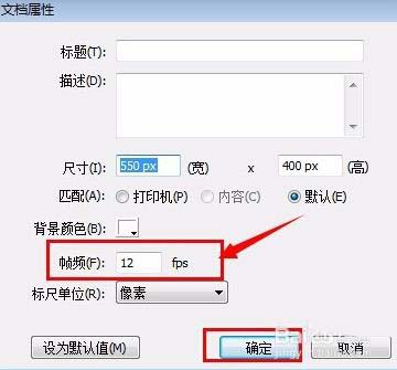 4、在彈出”文檔屬性“對話框中可以看到如圖所示的幀頻(f):12fps 的設置,直接修改框里的數值,然后點”確定“,修改完成。如果想動畫快數值要變大。一般常見設置24的比較多。