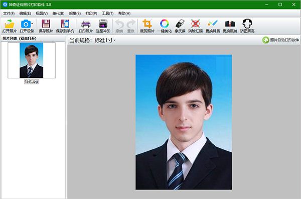 1、打開神奇證件照片打印軟件,選擇證照格式,打開一張照片或拍攝一張照片,如下圖所示:
