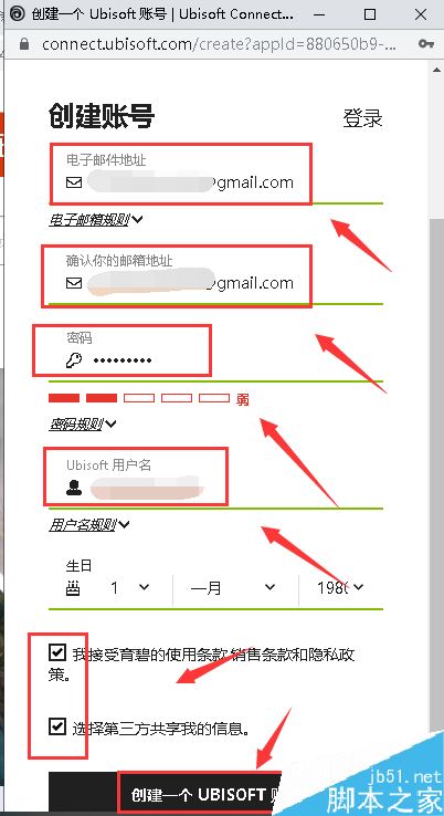 輸入你的Email賬戶,然后輸入賬號密碼、生日以及uplay的游行用戶名,同意協議,點擊創建一個UBIsoft賬號,如下圖所示