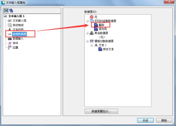然后我們雙擊文本輸入框,以打開文本輸入屬性對(duì)話框。將對(duì)話框切換至“鏈接數(shù)據(jù)源”選項(xiàng)卡,在右側(cè)數(shù)據(jù)源列表中選擇“副本”。意思是表單打印數(shù)據(jù)輸入選項(xiàng),對(duì)應(yīng)的就是指定每個(gè)標(biāo)簽的打印數(shù)量。單擊關(guān)閉即可。