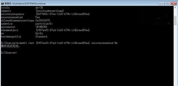 接著輸入bcdedit /set {GUID} recoveryenabled No回車運行,運行該命令后就會暫時禁用系統的自動啟動修復功能,其中的{GUID}即為上一步中記錄的字符,