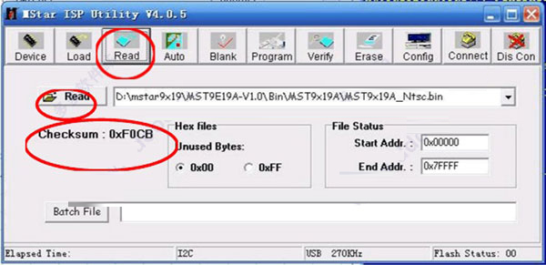 1、載入燒錄文件:打開ISP_Tool,點(diǎn)擊最上排圖標(biāo)中的Read,這時(shí)會(huì)出現(xiàn)一個(gè)載入燒錄BIN文件的操作介面,點(diǎn)擊下面Read,打開所需燒錄的Bin文件。同時(shí)可以在左邊可以看到該燒錄程序的checksum。