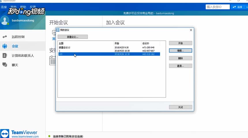 3、選擇一個(gè)會(huì)議,點(diǎn)擊開始。