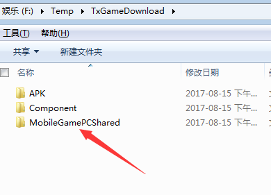 4、點開TxGameDownload 這個文件夾,然后可以看到里面有一個MobileGamePCShared的文件夾,我們苦苦尋找的apk游戲就在這里面喲