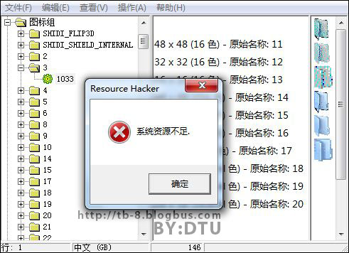 6. 接著點擊對應文件夾“3”的那個小"+"符號拉開,選中"1033"后 右邊的預覽框就會顯示出圖標的樣式。 (注意:此時會彈出一個錯誤的提示框,我們確定掉即可。后面才解釋)