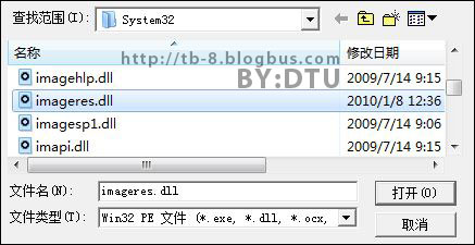2. 點擊菜單欄上的"文件(F)", 選擇第一項"打開(O)" 然后就顯示,選擇你要編輯的dll文件(此教程dtu就以 imageres.dll 來做示范)