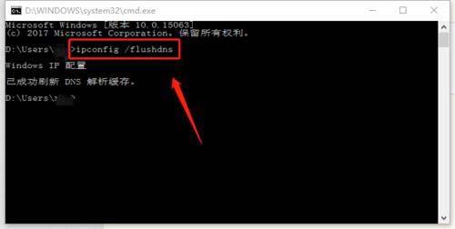 進入命令提示符界面輸入ipconfig /flushdns回車, 會顯示DNS本地緩存刷新成功,如下圖所示