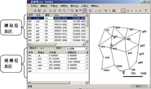 平差易2005主界面中包括測站信息區、觀測信息區、圖形顯示區以及頂部下拉菜單和工具條