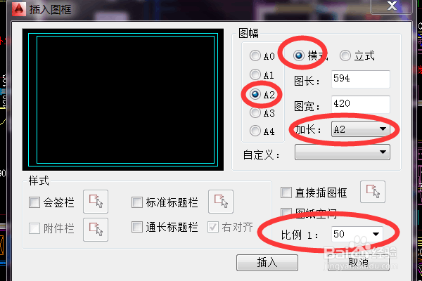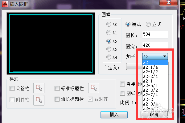 4、根據需要選擇自己要插入的圖框的大小以及方向,如圖所示。