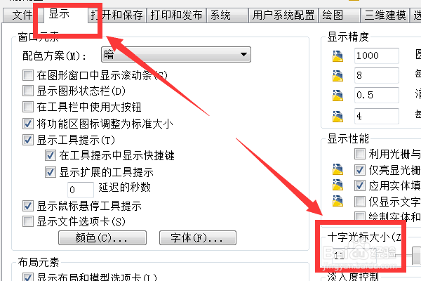 3、在彈出的對話框上方找到“顯示”選項,然后選擇右下角“十字光標大小”,如圖