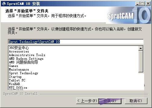 7、選擇SprutCAM v10開始菜單文件夾,默認即可,點擊【安裝】開始安裝