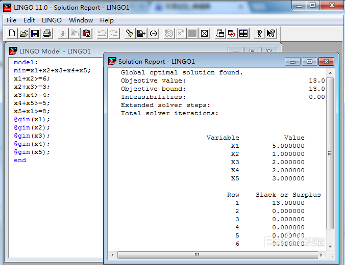 解決后,會彈出一個窗口,向你顯示目標函數值和每個變量的取值。問題解決。